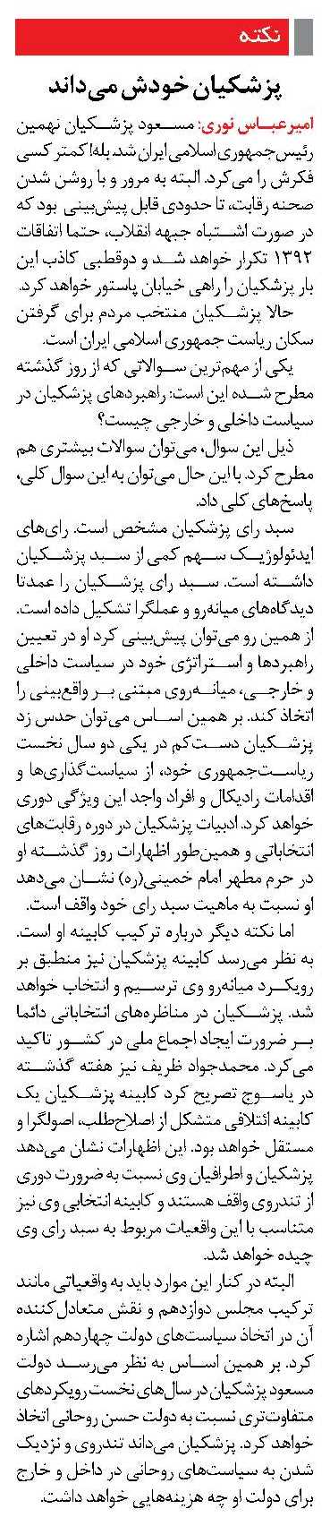 امیرعباس نوری: مسعود پزشکیان نهمین رئیسجمهوری اسلامی ایران شد. بله! کمتر کسی فکرش را میکرد. البته به مرور و با روشن شدن صحنه رقابت، تا حدودی قابل پیشبینی بود که در صورت اشتباه جبهه انقلاب، حتما اتفاقات 1392 تکرار خواهد شد و دوقطبی کاذب این بار پزشکیان را راهی خیابان پاستور خواهد کرد.