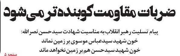 حضرت آیت‌الله‌العظمی خامنه‌ای رهبر حکیم انقلاب اسلامی در پیامی به مناسبت شهادت مجاهد کبیر و پرچمدار مقاومت، حجت‌الاسلام والمسلمین سیدحسن نصرالله ضمن تبریک و تسلیت  شهادت رهبر کم‌نظیر حزب‌الله به سراسر جبهه مقاومت و امت اسلامی و اعلام 5 روز عزای عمومی در کشور تأکید کردند: اساسی که او در لبنان پایه‌گذاری کرد و به دیگر مراکز قدرت، جهت بخشید، با فقدان سید عزیز مقاومت نه تنها از میان نخواهد رفت که به برکت خون او و دیگر شهیدان این حادثه، استحکام بیشتر خواهد یافت و ضربات جبهه مقاومت بر پیکر فرسوده و رو به زوال رژیم صهیونی کوبنده‌تر خواهد شد.