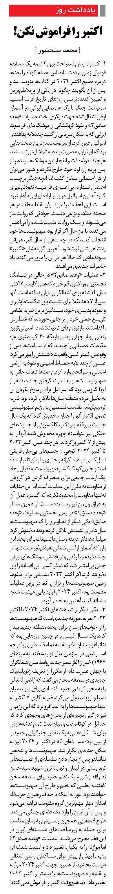 1- کمتر از زمان استراحت بین 2 نیمه یک مسابقه فوتبال زمان برد؛ شاید این جمله کوتاه را بعدها درباره مطلع اکتبر 2024 در کتاب‌ها بنویسند و پس از آن بگویند چگونه در یکی از پرتلاطم‌ترین و تعیین‌کننده‌ترین روزهای تاریخ غرب آسیا، سرنوشت جنگ با یک هنرنمایی ایرانی در آسمان ارض اشغال‌شده جهت دیگری یافت. عملیات «وعده صادق2» و نفوذ کهکشانی از موشک‌های فراصوت ایرانی که به شکل سریالی از گنبد چندلایه پدافندی اسرائیل عبور کرد، از سرنوشت‌سازترین صحنه‌هایی بود که ایرانیان به صورت زنده به تماشایش نشستند. هرچند نفوذ، دقت و انفجار این موشک‌ها آینده را از پس پرده رازآلود خود خارج نکرده و هنوز می‌توان از هر احتمالی سخن گفت اما آنچه دیگر برچسب احتمال ندارد، بی‌اعتباری فرضیه نفوذناپذیری گنبدآهنین اسرائیل در برابر اراده ایران به آغاز نبرد است. این لحظات را می‌توان نقاط عطف در هر صحنه جنگ و نزاعی دانست، حوادثی که روایت‌ساز می‌شوند و یک روایت تثبیت‌شده را بی‌اعتبار می‌کنند. با این حال اگر قرار بود صهیونیست‌ها خود انتخاب کنند که در چه ماهی از سال قاب عریانی پادشاهی‌شان ثبت شود، آخرین گزینه‌شان «اکتبر» بود؛ ماهی که حالا هر بار آن را مرور می‌کنند یاد خاطرات جدیدی می‌افتند.