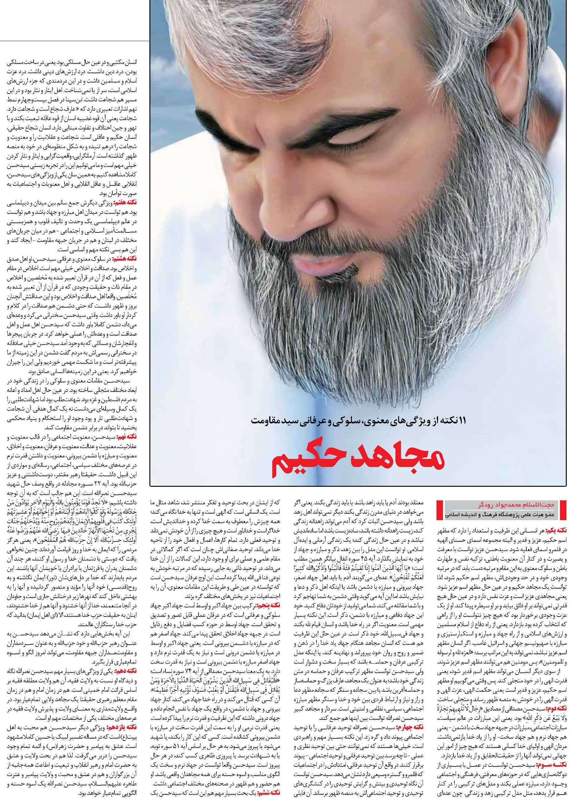 نکته نهم: سیدحسن، معنویت اجتماعی را در قالب معنویت و عقلانیت، معنویت و عدالت، معنویت و عرفان، معنویت و اخلاق، معنویت و مبارزه با دشمن بیرونی، معنویت و داشتن قدرت نرم در عرصههای مختلف سیاسی، اجتماعی، رسانهای و مواردی از این قبیل داشت. حقیقتا رهبر مقتدر، دوستداشتنی و عزیز حزبالله بود. آیه ۲۲ سوره مجادله در واقع وصف حال شهید سیدحسن نصرالله است. این هم جالب است که به آن توجه داشته باشیم: «لَا تَجِدُ قَوْمًا یُؤْمِنُونَ بِاللَّهِ وَالْیَوْمِ الْآخِرِ یُوَادُّونَ مَنْ حَادَّالله وَرَسُولَهُ وَلَوْ کَانُوا آبَاءَهُمْ أَوْ أَبْنَاءَهُمْ أَوْ إِخْوَانَهُمْ أَوْ عَشِیرَتَهُمْ أُولَئِکَ کَتَبَ فِی قُلُوبِهِمُ الْإِیمَانَ وَأَیَّدَهُمْ بِرُوحٍ مِنْهُ وَیُدْخِلُهُمْ جَنَّاتٍ تَجْرِی مِنْ تَحْتِهَا الْأَنْهَارُ خَالِدِینَ فِیهَا رَضِیَالله عَنْهُمْ وَرَضُوا عَنْهُ أُولَئِکَ حِزْبُالله أَلَا إِنَّ حِزْبَالله هُمُ الْمُفْلِحُونَ»، یعنی هرگز مردمی را که ایمان به خدا و روز قیامت آوردهاند چنین نخواهی یافت که دوستی با دشمنان خدا و رسول او کنند، هر چند آن دشمنان پدران یا فرزندان یا برادران یا خویشان آنها باشند. این مردم پایدارند که خدا بر دلهایشان (نور) ایمان نگاشته و به روح(قدسی) خود آنها را مؤید و منصور گردانیده و آنها را به بهشتی داخل کند که نهرها زیر درختانش جاری است و جاودان در آنجا متنعمند، خدا از آنها خشنود و آنها هم از خدا خشنودند، اینان به حقیقت حزب خدا هستند، الا (ای اهل ایمان) بدانید که حزب خدا رستگاران عالمند.