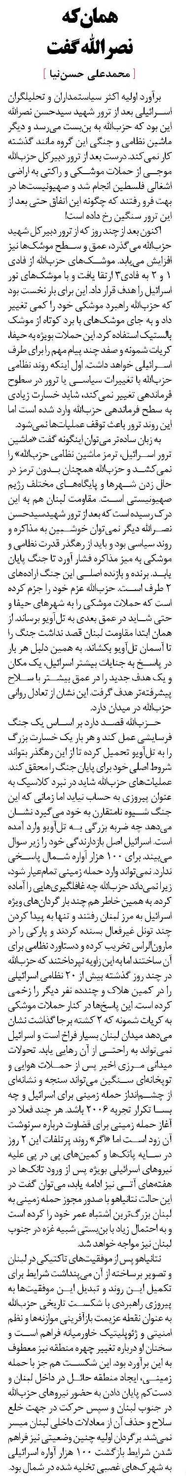 اکنون بعد از چند روز که از ترور دبیرکل شهید حزبالله میگذرد، عمق و سطح موشکها نیز افزایش مییابد. موشکهای حزبالله از فادی 1 و 2 به فادی3 ارتقا یافت و با موشکهای نور اسرائیل را هدف قرار داد. این برای بار نخست بود که حزبالله راهبرد موشکی خود را کمی تغییر داد و به جای موشکهای با برد کوتاه از موشک بالستیک استفاده کرد. این حملات بویژه به حیفا، کریات شمونه و صفد چند پیام مهم را برای طرف اسرائیلی خواهد داشت. اول اینکه روند نظامی حزبالله با تغییرات سیاسی یا ترور در سطوح فرماندهی تغییر نمیکند، شاید خسارت زیادی به سطح فرماندهی حزبالله وارد شده است اما این روند ترور باعث توقف عملیاتها نمیشود.