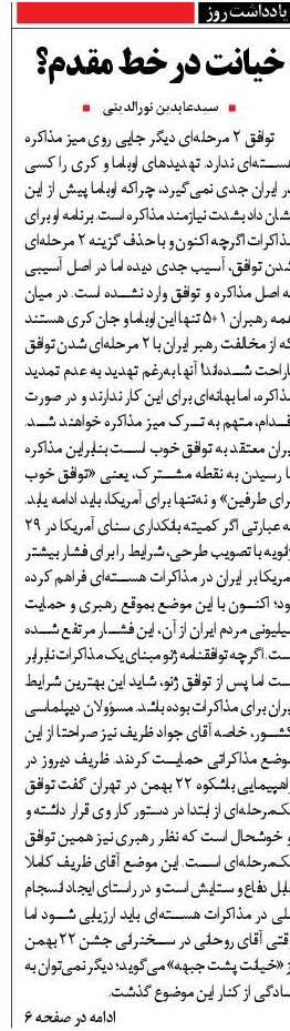 اگر قرار باشد موضوع هسته‌ای که موضوعی ملی است به صورت دقیق واکاوی شود، نباید مصلحت را بر آگاهی مردم ترجیح داد. دانستن حق مردم است. بویژه اینکه مردم بدانند در میز مذاکره بر سر حقوق آنها چه می‌گذرد. پس اگر قرار است سخن از خیانت به میان آید، نباید عده‌ای از اینکه مردم بفهمند واقعیت چیست، ناراحت شوند. اگر قرار است مردم با خائنان آشنا شوند، نباید یادآوری رویدادها برای آقایان ناخوشایند باشد. آقای روحانی از خیانت پشت جبهه می‌گوید؛ درحالی که ایشان نباید از اعتراض‌ها نسبت به طرح دغدغه‌های حزبی توسط آقای ظریف در شورای روابط خارجی آمریکا عصبانی شود. در پایان باید گفت خیانت جایی است که توافقی بدون لغو همه تحریم‌ها صورت گیرد.