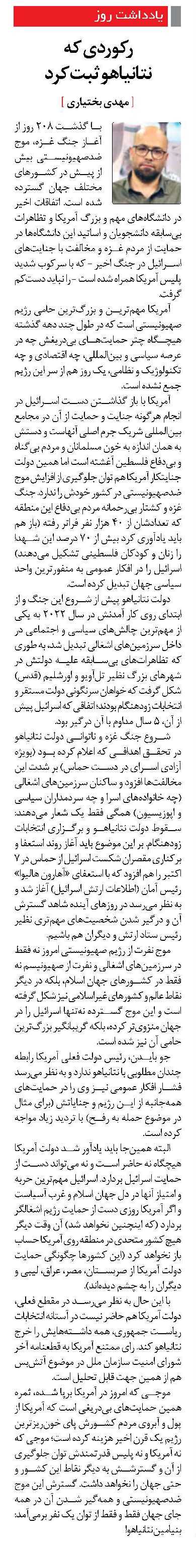 موجی که امروز در آمریکا برپا شده، ثمره همین حمایتهای بیدریغی است که آمریکا از پول و آبروی مردم کشورش پای خونریزترین رژیم یک قرن اخیر هزینه کرده است؛ موجی که نه آمریکا و نه پلیس قدرتمندش توان جلوگیری از آن و گسترشش به دیگر نقاط این کشور و حتی جهان را نخواهد داشت. گسترش این موج ضدصهیونیستی و همهگیر شدن آن در همه جای جهان فقط و فقط از توان یک نفر برمیآمد: بنیامین نتانیاهو!