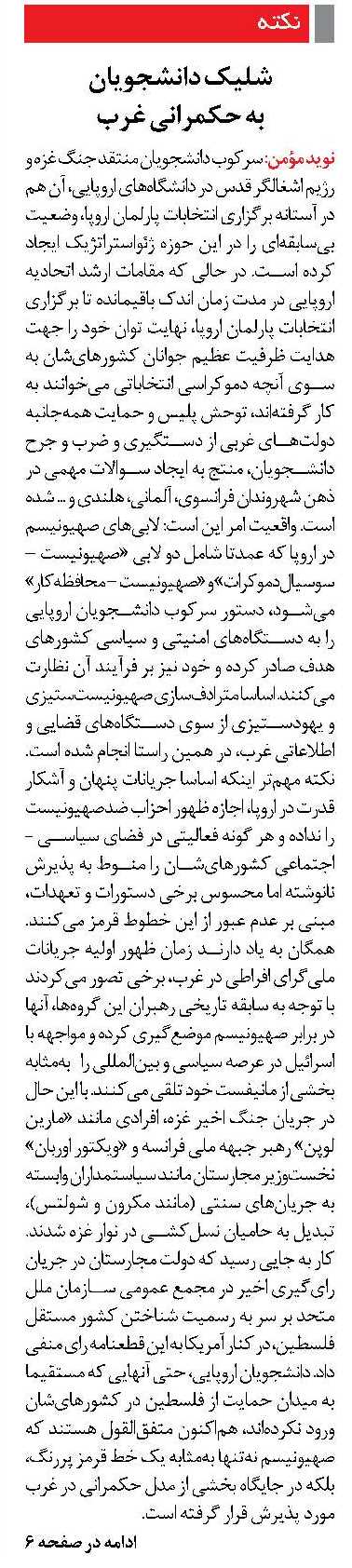 نوید مؤمن: سرکوب دانشجویان منتقد جنگ غزه و رژیم اشغالگر قدس در دانشگاههای اروپایی، آن هم در آستانه برگزاری انتخابات پارلمان اروپا، وضعیت بیسابقهای را در این حوزه ژئواستراتژیک ایجاد کرده است. در حالی که مقامات ارشد اتحادیه اروپایی در مدت زمان اندک باقیمانده تا برگزاری انتخابات پارلمان اروپا، نهایت توان خود را جهت هدایت ظرفیت عظیم جوانان کشورهایشان به سوی آنچه دموکراسی انتخاباتی میخوانند به کار گرفتهاند، توحش پلیس و حمایت همهجانبه دولتهای غربی از دستگیری و ضرب و جرح دانشجویان، منتج به ایجاد سوالات مهمی در ذهن شهروندان فرانسوی، آلمانی، هلندی و ... شده است. واقعیت امر این است: لابیهای صهیونیسم در اروپا که عمدتا شامل دو لابی «صهیونیست – سوسیالدموکرات» و «صهیونیست – محافظهکار» میشود، دستور سرکوب دانشجویان اروپایی را به دستگاههای امنیتی و سیاسی کشورهای هدف صادر کرده و خود نیز بر فرآیند آن نظارت میکنند. اساسا مترادفسازی صهیونیستستیزی و یهودستیزی از سوی دستگاههای قضایی و اطلاعاتی غرب، در همین راستا انجام شده است. نکته مهمتر اینکه اساسا جریانات پنهان و آشکار قدرت در اروپا، اجازه ظهور احزاب ضدصهیونیست را نداده و هر گونه فعالیتی در فضای سیاسی - اجتماعی کشورهایشان را منوط به پذیرش نانوشته اما محسوس برخی دستورات و تعهدات، مبنی بر عدم عبور از این خطوط قرمز میکنند. همگان به یاد دارند زمان ظهور اولیه جریانات ملیگرای افراطی در غرب، برخی تصور میکردند با توجه به سابقه تاریخی رهبران این گروهها، آنها در برابر صهیونیسم موضعگیری کرده و مواجهه با اسرائیل در عرصه سیاسی و بینالمللی را بهمثابه بخشی از مانیفست خود تلقی میکنند. با این حال در جریان جنگ اخیر غزه، افرادی مانند «مارین لوپن» رهبر جبهه ملی فرانسه و «ویکتور اوربان» نخستوزیر مجارستان مانند سیاستمداران وابسته به جریانهای سنتی (مانند مکرون و شولتس)، تبدیل به حامیان نسلکشی در نوار غزه شدند. کار به جایی رسید که دولت مجارستان در جریان رایگیری اخیر در مجمع عمومی سازمان ملل متحد بر سر به رسمیت شناختن کشور مستقل فلسطین، در کنار آمریکا به این قطعنامه رای منفی داد. دانشجویان اروپایی، حتی آنهایی که مستقیما به میدان حمایت از فلسطین در کشورهایشان ورود نکردهاند، هماکنون متفقالقول هستند که صهیونیسم نهتنها بهمثابه یک خط قرمز پررنگ، بلکه در جایگاه بخشی از مدل حکمرانی در غرب مورد پذیرش قرار گرفته است.