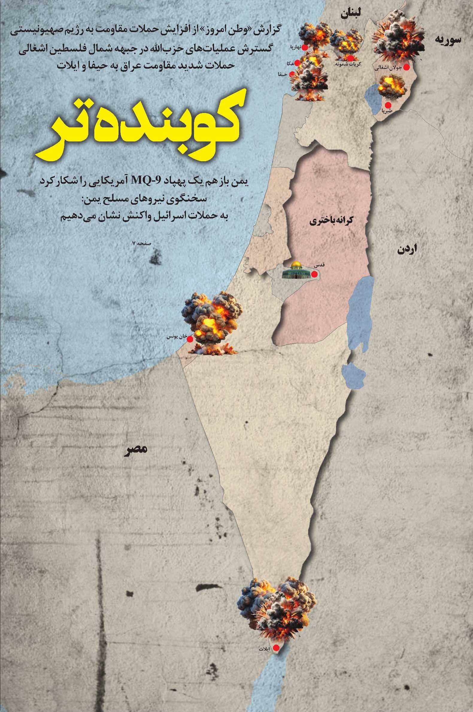 گزارش «وطن امروز» از افزایش حملات مقاومت به رژیم‌صهیونیستی؛ گسترش عملیات‌‌های حزب‌الله در جبهه شمال فلسطین اشغالی حملات شدید مقاومت عراق به حیفا و ایلات