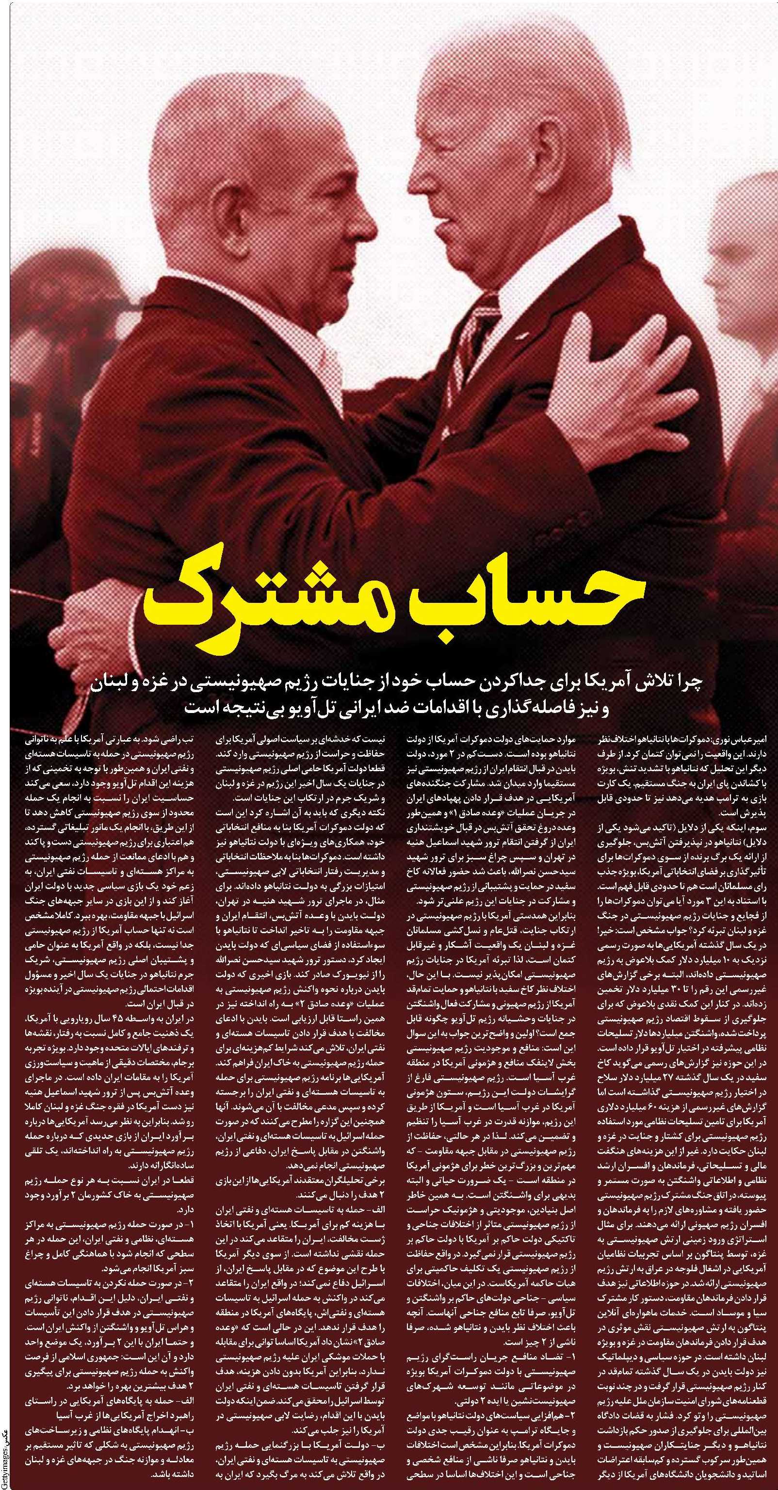ب- دولت آمریکا با بزرگنمایی حمله رژیم صهیونیستی به تاسیسات هستهای و نفتی ایران، در واقع تلاش میکند به مرگ بگیرد که ایران به تب راضی شود. به عبارتی آمریکا با علم به ناتوانی رژیم صهیونیستی در حمله به تاسیسات هستهای و نفتی ایران و همینطور با توجه به تخمینی که از هزینه این اقدام تلآویو وجود دارد، سعی میکند حساسیت ایران را نسبت به انجام یک حمله محدود از سوی رژیم صهیونیستی کاهش دهد تا از این طریق، با انجام یک مانور تبلیغاتی گسترده، هم اعتباری برای رژیم صهیونیستی دست و پا کند و هم با ادعای ممانعت از حمله رژیم صهیونیستی به مراکز هستهای و تاسیسات نفتی ایران، به زعم خود یک بازی سیاسی جدید با دولت ایران آغاز کند و از این بازی در سایر جبهههای جنگ اسرائیل با جبهه مقاومت، بهره ببرد. کاملا مشخص است نه تنها حساب آمریکا از رژیم صهیونیستی جدا نیست، بلکه در واقع آمریکا به عنوان حامی و پشتیبان اصلی رژیم صهیونیستی، شریک جرم نتانیاهو در جنایات یک سال اخیر و مسؤول اقدامات احتمالی رژیم صهیونیستی در آینده بویژه در قبال ایران است.