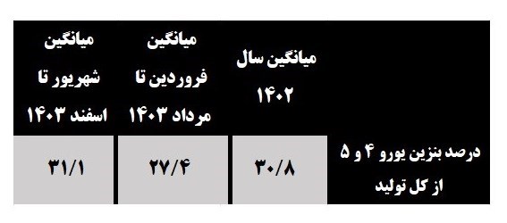 سهم تولید بنزین یورو 4 و یورو 5 از مجموع بنزین تولیدی کشور در سال 1402 بالغ بر 30.8 درصد بوده که این میزان در فاصله زمانی فروردین تا مرداد 1403 به 27.4 درصد کاهش یافته است. سهم تولید بنزین یورو 4 و یورو 5 از مجموع بنزین تولیدی کشور که در فاصله زمانی شهریور تا اسفند 1403 بهطور متوسط 105 میلیون و 200 هزار لیتر بود، به 31.1 درصد رسید.